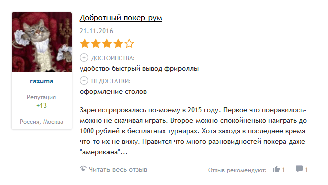 В целом клиентам нравится организация работы саппортного отдела. Игроки часто сообщают о том, что сотрудники исполняют свои обязанности добросовестно и оперативно. Помимо этого, покеристы говорят о таких преимуществах саппорта в сравнении с зарубежными конкурентами: